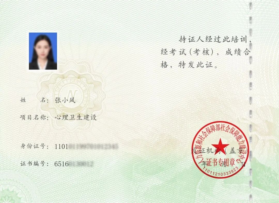 发证条件:学时达标且考核合格后,由人社部能力建设中心颁发 《心理卫生建设培训证书》。